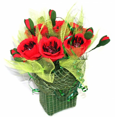 Практично повна імітація квіток маку, єдина відмінність, що в нашому букеті в бутонах дбайливо заховані 15 найсмачніших цукерок, які не залишать байдужим людині якій вручать такий подарунок. Використовуються: цукерки "Рошен", "АВК", "Світоч". Елементи оформлення цукеркової композиції можуть бути трохи змінені без порушення кількості цукерок, загальної стилістики та кольорової гами. Розмір: 24х22 см