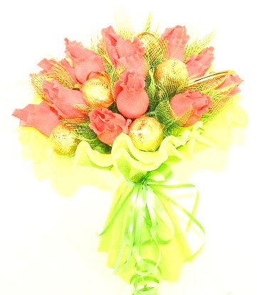 Букет з цукерок - приємний подарунок дівчині з нагоди побачення або з нагоди пам'ятної дати, в будь-якому випадку Ваш подарунок не залишиться непоміченим і ви помітите радість своєї коханої від такого оригінального подарунка. Використовуються: цукерки "Рошен", "АВК" та "Світоч" (21 шт.). Елементи оформлення цукеркової композиції можуть бути трохи змінені без порушення кількості цукерок, загальної стилістики та кольорової гами. Розмір: 20 х 15 см