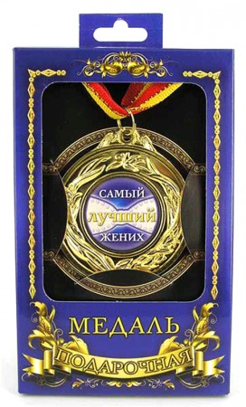 Подарункова медаль для найкращого нареченого. Матеріал – кольоровий метал, двоколірна тканинна стрічка. На обороті медалі - місце для підпису та короткого побажання. Упаковка - фірмова демо-коробка з підставкою та євро петлею.
