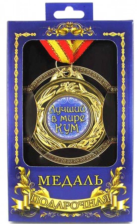 Сделайте своему куму по настоящему ценный подарок. Материал - цветной металл, двухцветная тканевая лента. На обороте медали - место для подписи и короткого пожелания. Упаковка - фирменная демо-коробка с подставкой и евро петлей.