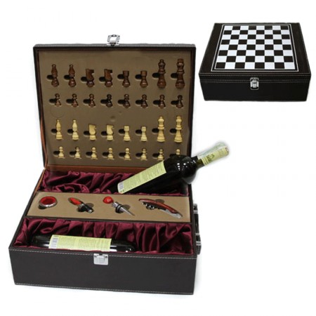 Мінібар - Шахи на дві пляшки з аксесуарами для вина, та захоплюючою грою в шахи, яка не дозволить вам нудьгувати вечорами. Чудовий подарунок для справжніх гурманів вишуканих вин.