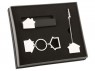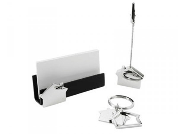 Оригінальні аксесуари будиночка будуть корисним подарунком для ваших друзів і колег по роботі. Набір вміщує підставку під візитки, тримач для документів і чудовий брелок.