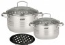 Набор посуды из 5 предметов, добротно подойдет для начинающих кулинаров. Матовая и зеркальная полировка,нержавеющее покрытие и термоаккумулирующее дно равномерно распределяющее тепло,порадуют Вашим кулинарным шедевром всю семью.