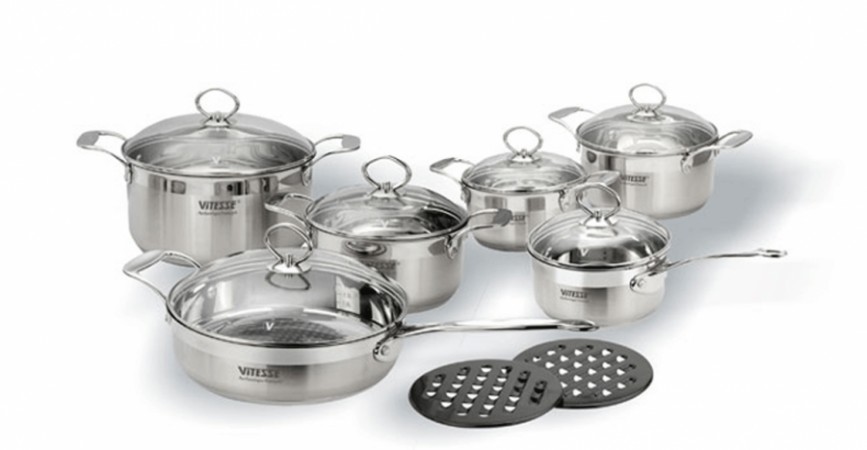 Большой набор посуды для большой семьи.14 предметов выполнены из высококачественной нержавеющей стали, что прослужит Вам долгие годы. Материал по своим характеристикам соответствует всем гигиеническим требованиям, предъявляемым к посуде: долговечен, не окисляется, устойчив к коррозии, не изменяет, вкусовые качества и запах продуктов,одним словом - находка для домохозяйки!