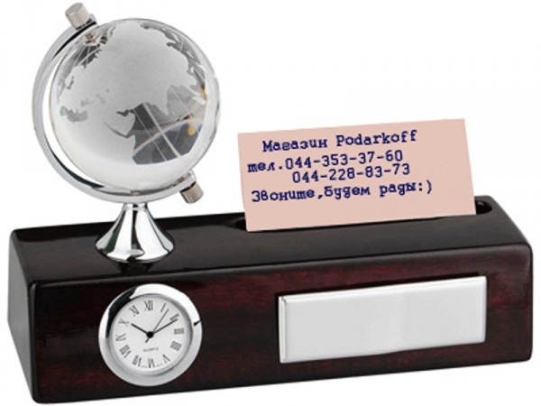 Оригінальна настільна підставка компактних розмірів, має такі переваги як невеликі розміри, що призводить до економії місця на робочому столі і при цьому функціональність даної моделі нічим не гірша ніж у більш громіздких. Стане чудовим доповненням на робочому столі. : Даний прилад включає підставку під візитки, годинник та глобус.