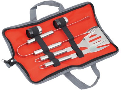 Набір для барбекю складається з 5 предметів, в ньому є лопатка, щипці, виделка, перечниця і сільничка, ці предмети необхідні для того, щоб Ваше барбекю перетворилося на справжнє свято, а приготування їжі стало в радість, з таким набором приготування барбекю не займе багато місця навіть якщо Ви будете далеко від дому.