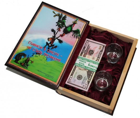 Стильний та оригінальний подарунок любителям таких занять, як полювання. На вигляд звичайна книга, а внутрішньо-ділова порада. "Книга-скринька" - являє собою заначку - пачка грошей (100 $ за приколом, але щоб людина якому Ви це подарували була в шоці, можете зверху вкласти і справжню купюру) і "зрозуміти на двох" - дві чарки, щоб обмити дійство в честь іменинника. Але крім цього набір можна доповнити: для чоловіка-вкласти туди джентльменський набір, а для жінки якісь стильні жіночі штучки, ну в крайньому випадку людина, якій Ви зробите цей подарунок і сама придумає, що туди можна покласти.