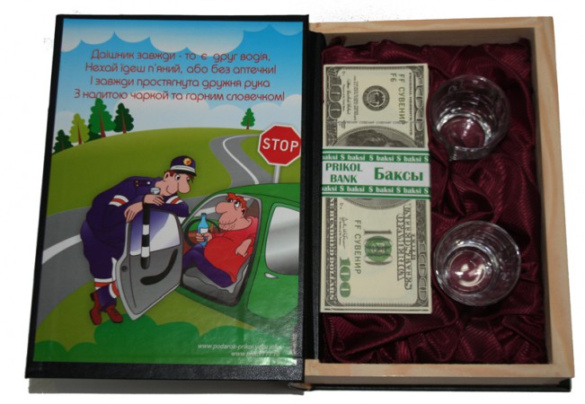 Важкий аргумент, на зауваження інспектора ДАІ! Книга є " заначку " , у якій можна зберігати все, починаю від зарплати, закінчуючи дрібними цінними речами, тому що книга нічим не відрізняється від справжньої літератури. В оригіналі, наповненням книги служить пачка штучних доларів, і три чарки, що можна було б правильно "парувати зауваження" автоінспектора. Прекрасний подарунок будь-якому автомобілісту.