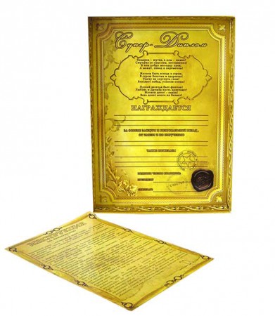 Отличный подарок самому любимому человеку,выполнен в виде сундучка с сокровищами. Внутри красиво выложены подарочки: именная золотая медаль; ключ к сердцу; колокольчик – брелок ,чтоб выполнять желания любимого (а можно и наоборот),и наручники любимым – для любовных утех. Кроме того,крышка коробки является супер дипломом в "позолоченной" раме. Впишите туда Ваши пожелания, и повесьте на видном месте. А еще, в комплекте подарка - шуточная инструкция по применению, в которой весело объясняется, что делать со всем этим добром. Такой презент, не останется