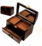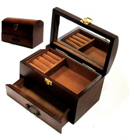 Скринька виготовлена з темного дерева і має два відділення. У відкритому положенні з'являється можливість скористатися великим дзеркалом. Зсередини відділення обтягнуті оксамитом.