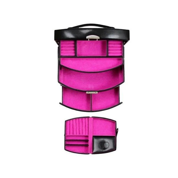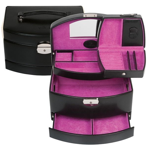 Середній рівень вміщує знімну скриньку для подорожей, в якій є валики для кілець, платівки для сережок та 2 відділення, одне з яких закривається кришкою;