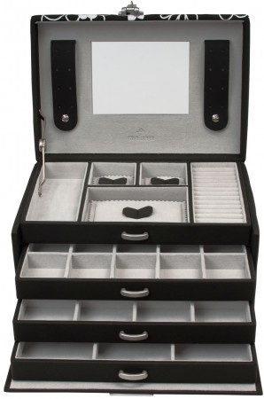 Гарний подарунок для коханої половинки. Виготовляється модель у кількох кольорових забарвленнях, має відділення як для дрібних, так і великих коштовностей.