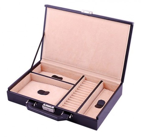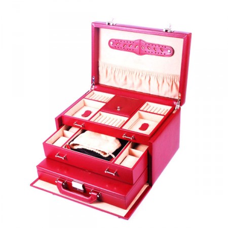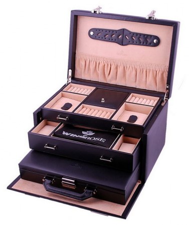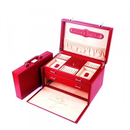 Багатофункціональна та високо-містка скринька, яка задовольнить примхи будь-якій любительці коштовностей та біжутерії. Зовнішня обробка зроблена шкірою, внутрішня-матеріалом, що за своїми характеристиками нагадує велюр. Так само скринька має додатковий кейс для коштовностей, який дозволяє носити необхідні прикраси завжди з собою.