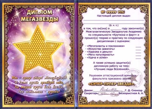 Характеристики товару Диплом - прикол " Мегазвезда "