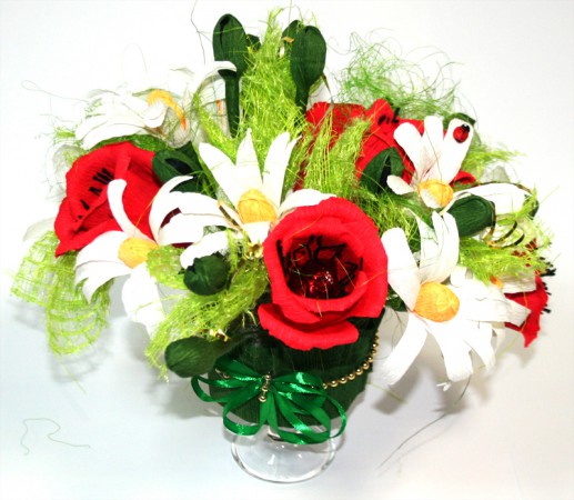 Симпатичный букет изготавливается мастером вручную, при небольших габаритах букет выглядит очень презентабельно и солидно благодаря чему такой букет станет отличным подарком как молодой девушке так и женщине в возрасте. Используются: 27шт,конфет "АВК", "Рошен", "Свиточ". Элементы оформления конфетной композиции могут быть незначительно изменены без нарушения количества конфет, общей стилистики и цветовой гаммы. Размер: 20 х 30 см