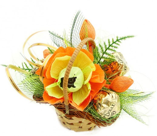 Компактный букет из конфет прекрасный способ сделать трогательный и приятный подарок, например, младшей сестренке. Вся композиция размещается в корзинке которую можно использовать и в дальнейшем. Используются: конфеты "Рошен", "АВК", "Свиточ" (7 шт.) Элементы оформления конфетной композиции могут быть незначительно изменены без нарушения количества конфет, общей стилистики и цветовой гаммы. Размер: 17 х 17 см