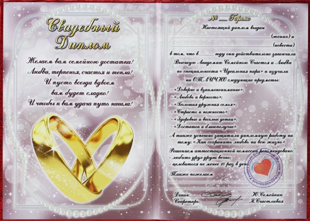 Прекрасне доповнення до основного подарунка, наприклад, на весілля. Прикольний диплом радуватиме око свого володаря. Розміри товару, див: 21х15х1. Арт: DGP08 Пр.