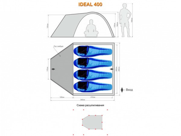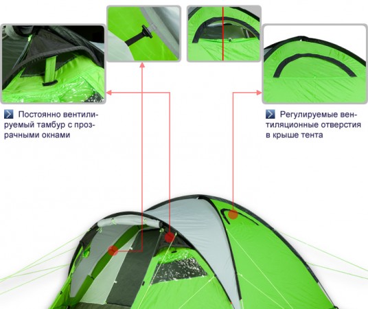 Чотиримісний туристичний намет підвищеної комфортності з розвиненим тамбуром і гнучко регульованою вентиляцією. Придатна для тривалої подорожі та походів вихідного дня. Внутрішній намет ще на стадії виробництва кріпиться до тенту, що спрощує і прискорює його встановлення, а також уберігає від змочування дощем.