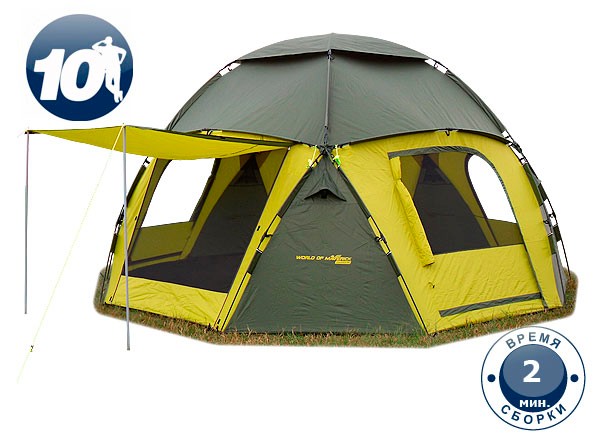 Якщо на природу збирається хвора компанія, то доцільно, щоб не брати кілька наметів, взяти один намет-тент, у зв'язку з тим, що такі намети мають більш підвищену місткість, ніж звичайні намети. Його розміри дозволяють комфортно розміститися всередині групи з 8 чоловік, причому його можна використовувати як на короткочасних виїздах (1-2 дні), так і при тривалих походах, а за своєю конфігурацією статті, палатка є десятикутником. Дана модель має п'ять великих входів-дверей, шкірна з них закривається сіткою протимоскітною і зверху сітки дублюється дождезахисною стінкою. І сітки та стінки фіксуються з боків застібками-«блискавками». Між шкірним входом для покращення вентиляції є невелике вікно, яке також забезпечене протимоскіткою та дублюється дождезахисним клапаном на «блискавці». Для покращення вентиляції, у крыші палатки передбачені 5 вентиляційних відвернень протимоскітними сітками, так що для комфортного перебування в палатці великої кількості людей передбачені всі умови.