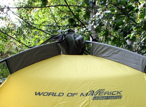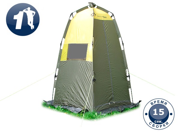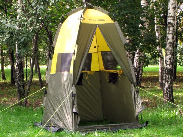 Без такого пристосування не обійдеться жоден тривалий виїзд на природу, адже відпочинок має бути комфортним, а який комфорт за відсутності душу/туалету? Дана модель призначена для облаштування стаціонарних туристичних таборів, виготовлена з міцних сучасних матеріалів, посилена розтяжками та широкою спідницею, є стійкою конструкцією, здатною витримати сильні шквали вітру. До внутрішньої поверхні тенту пришити монтажні петлі для кріплення душового бачка максимальним літражем 10л. Швидкозбірний (RAPIDEX Quick Erect System) каркас виконаний з легкого і міцного фібергласу, що не змусить Вас сумніватися в міцності конструкції. На бічних стінках є 3 вікна, закриті москітними сітками. У разі дощу вікна закриваються із зовнішнього боку шторками внахлест для запобігання попаданню води всередину тенту.