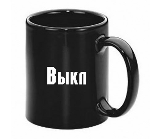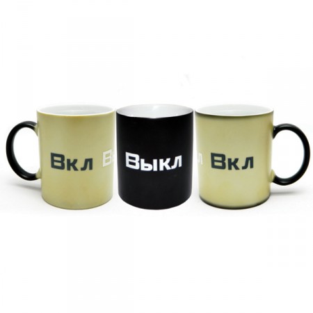 Дуже незвичайна чашка, яка має свою "родзинку". Чашка цікава тим, що змінює колір та напис під дією гарячого напою. Якщо налити в кухоль напій з температурою вище 70 градусів, то чашка змінить свій колір з чорного на білий і напис "ВИКЛ" змінюється на "ВКЛ".