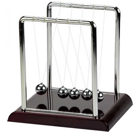 Чудовий засіб для заспокоєння нервів. Кульки б'ються одна про одну, уявляючи якусь подобу вічного двигуна. Хороше доповнення до Вашого робочого столу.