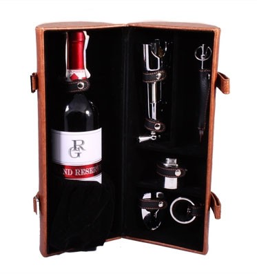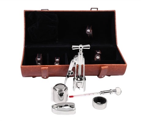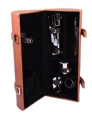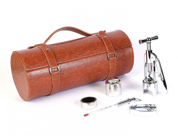 Чудовий подарунок для поціновувачів справжнього вина – ексклюзивний винний набір німецької фірми Tong. Набір є чудовим тубусом зі шкіри коричневого кольору з внутрішнім оздобленням з чорного оксамиту. У ньому Ви знайдете набір необхідних аксесуарів для розпивання вин: зручний штопор, термометр, пробка для пляшки, манжет, ніж для зняття пакувальної плівки. Так само крім усього перерахованого вище, набір має відділення під стандартну пляшку вина. Футляр оснащений спеціальною ручкою для перенесення та зручно розташовується в руці.