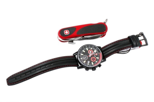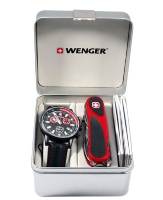 Подарунковий набір від швейцарського бренду Wenger стане це стильним і шикарним презентом елегантному чоловікові, який гідно цінує справжню швейцарську якість і надійність. Складається набір з наручного годинника Wenger Commando Chrono 70731.XL, армійського ножа Wenger EvoGrip 1.17.59.821 та футляра з міцного та легкого металу. Годинник має високоточний кварцовий механізм, а сам корпус виготовляється з нержавіючої сталі. Годинник комплектується браслетом з нержавіючої сталі, шкіряним ремінцем або силіконовим ремінцем. Стрілки годинника, цифри та мітки в деяких моделях покриті спеціальним складом Super Luminova, який миттєво «заряджається» при попаданні на сонячне світло і здатний тривалий час світитися в темряві. Всі годинники Wenger витримують тиск води на глибині – від 30 м до 1000 м (у спеціальних моделях).