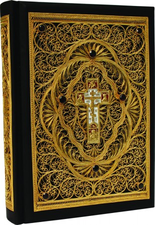 Дана Біблія має шкіряну палітурку ручної роботи та оформлення:: філігрань ручної роботи вкрита золотом, гранати, художнє лиття вкрите золотом, розписане вручну гарячою емаллю. Біблія упакована в скриньку з натуральної замші ручної роботи, завдяки чому вона стане чудовим елітним подарунком.