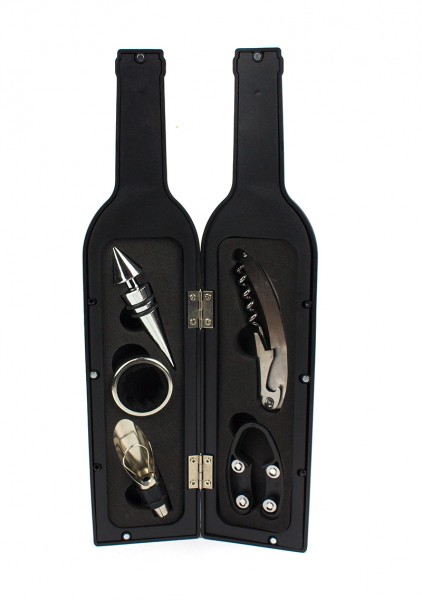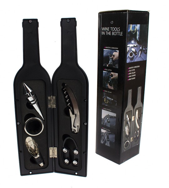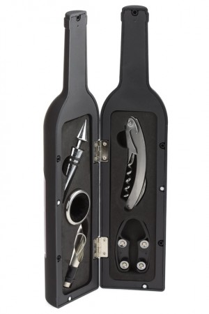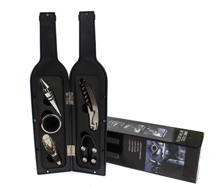 Супер корисний набір зроблений на вигляд пляшки з-під вина, в ньому є все що необхідно для вечірніх посиденьок у колі коханого/коханої, друзів або просто в хорошій компанії.