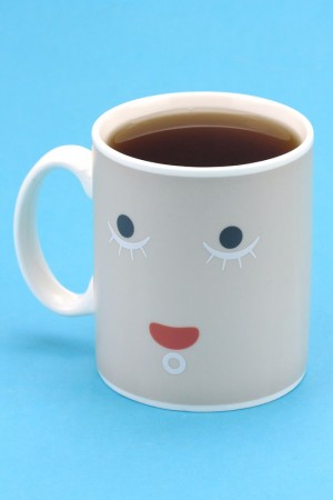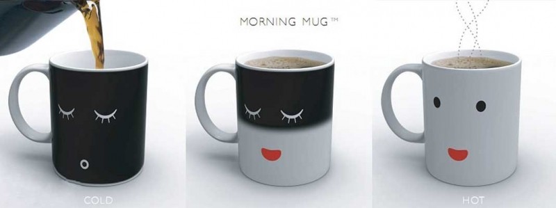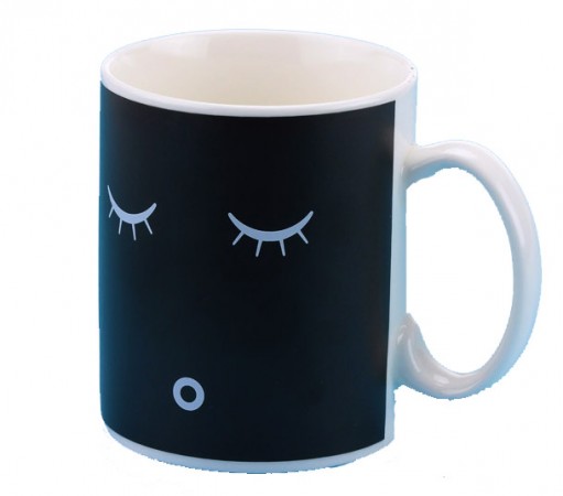 Ця чашка зроблена спеціально для ранку. Кухоль чорний і сплячий, але варто в неї налити будь-який гарячий напій і він починає прокидатися від глибокого сну. Тоді чашка стає білою і з'являються очі та губки.