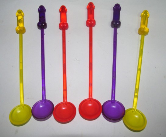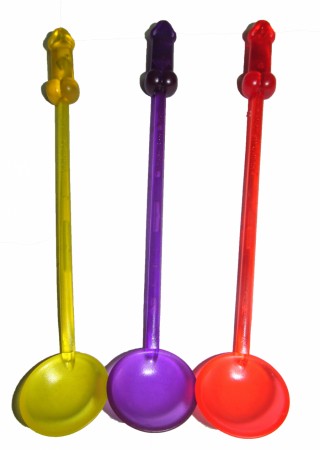Кумедна ложка для помішування коктейлів, яка має ручку Віллі. У набір входить 6 штук: 2 жовті, 2 фіолетові та 2 червоні.