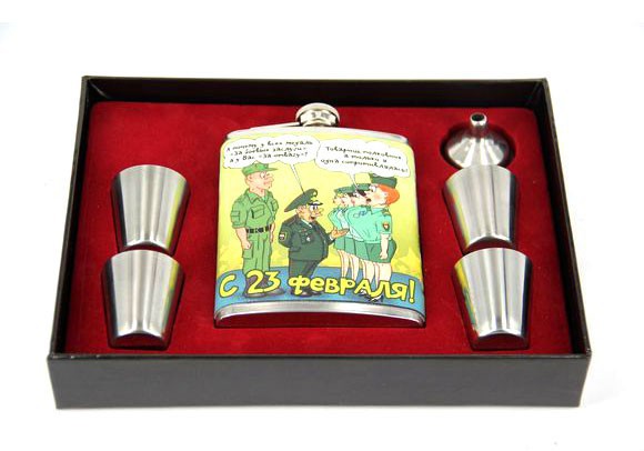 Бюджетний подарунок, який чудово підійде як презент на 23 лютого. Складається з фляги на 8 унцій, 4-х склянок та лійки.