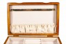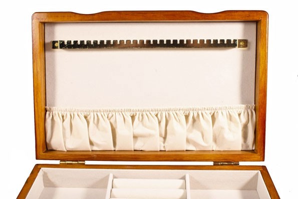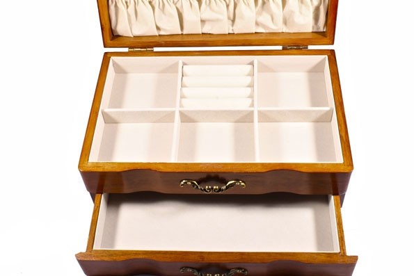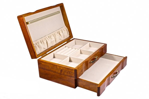 Двоярусна скринька для прикрас, виготовлена з дерева і стилізована під колір горіха, що робить її контрастним елементом, який впишеться практично в будь-який декор.