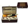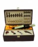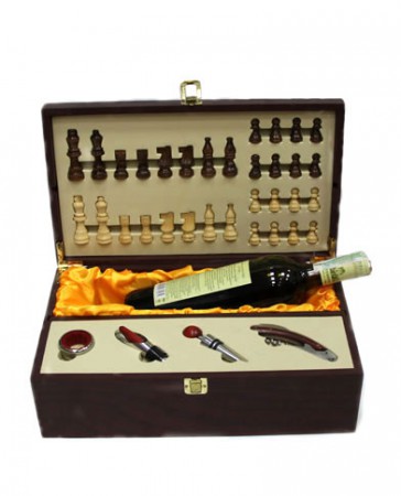 Дуже цікавий винний набір, без перебільшення, можна назвати "багатофункціональним"! Виготовлений футляр з дерева, має набір винних аксесуарів, які допоможуть без проблем розкрити пляшку гарного вина, а під час розпивання алкогольного напою, можна грати партію в шахи, які так само вбудований у даний набір.