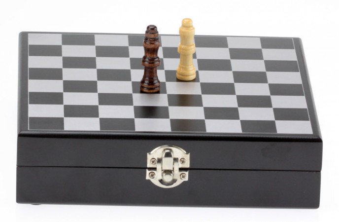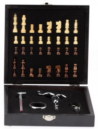 Дуже оригінальний набір, що включає компактні шахи, і набір аксесуарів для вина. Єдине чого не вистачає з таким подарунком, то це пляшки гарного вина.