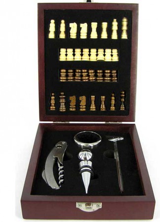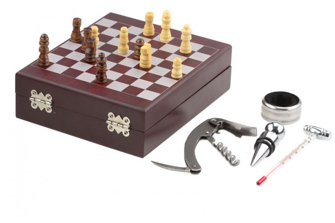 Набір аксесуарів для вина в дерев'яному кейсі є саме тією річчю, яку можна дарувати практично на будь-який привід. Крім того, в комплекті йдуть шахи для коротання дозвілля.