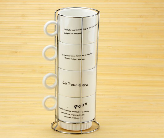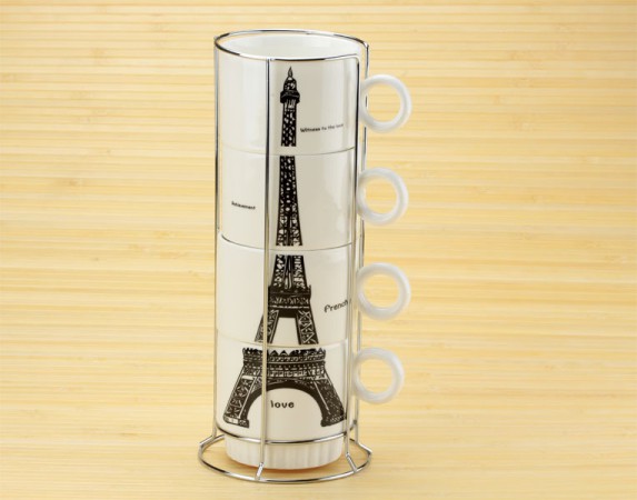 Прекрасний набір кавових чашок, завдяки спеціальній підставці, чашки вишиковуються в Ейфелеву вежу, а позаду кожної чашки - нехитрі фрази французькою.