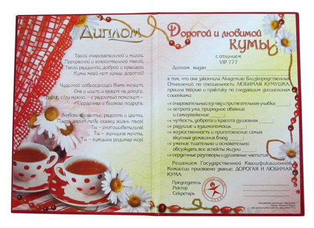 Подарочный диплом, получив который, Ваша кума будет Вам непременно благодарна. Неотъемлемый атрибут свадебного мероприятия.
