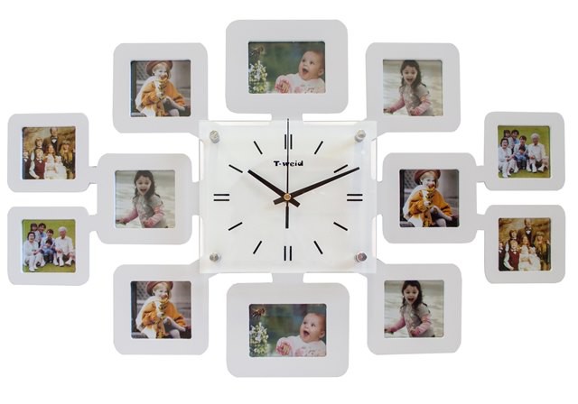 Настінна мультирамка з годинником, включає 12 фоторамок, з яких 10 - квадратні, 7х7 см, за назвою як би натякають які саме фотографії варто там зберігати. Інші 2 фоторамки мають розмір 9х7 см, що в сумі дає Вам чудовий подарунок, який "приживеться" у будь-якій кімнаті.