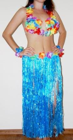 Перед Вами представлен карнавальный костюм который отлично подойдет для тематической вечеринки.Юбка застегивается на липучку и имеет универсальный размер,а верх декорирован цветами.Бюст держится на завязках и имеет второй размер,украшен искусственными цветами.В виде дополнительных аксессуаров Вы получаете повязку на голову, 2 браслета и лею на шею.С таким нарядом,Вы на вечеринке точно не останетесь незамеченной.