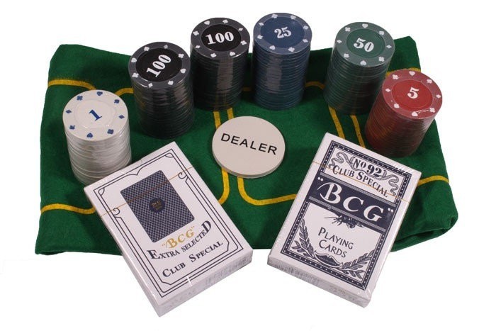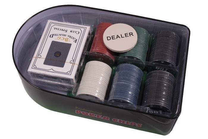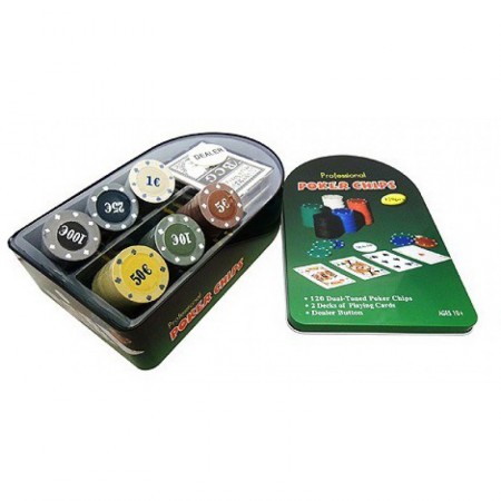 Невеликий набір гральних фішок для покеру, який Ви завжди зможете взяти з собою в поїздку, або ж просто пограти вдома з друзями. Такий набір дасть можливість зіграти 3-4 людям, і при цьому комфортно себе почувати. номіналом (номінал фішок: 1, 5, 10, 25, 50 і 100), колодою карт та фішкою дилера, для більш якісної гри.