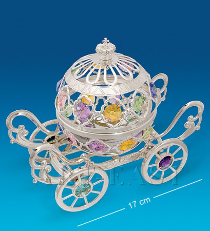 Розкішна за своїм дизайном та характеристиками фігурка, яка послужить чудовим подарунком Вашій другій половинці до Дня Закоханих. Вона виконана у вигляді карети, яка прикрашена різнобарвним камінням від "Swarovski". Крім декоративного прикраси статуетка зможе послужити як скринька для прикрас, або інших дрібниць. Завдяки якісному матеріалу виготовлення (метал) і срібному покриттю вона зможе радувати Вас довгий час.