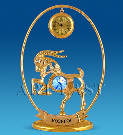 Чудова фігурка із зображенням сильного і цілеспрямованого знака Козерога. Вона чудово буде дивитися за робочим столом, а завдяки наявності годинників Ви завжди зможете без проблем дізнатися час. Фігурка виготовлена з якісного металу, вкрита золотом і прикрашена кристалами від "Swarovski". Така статуетка стане чудовим подарунком на будь-яке свято.