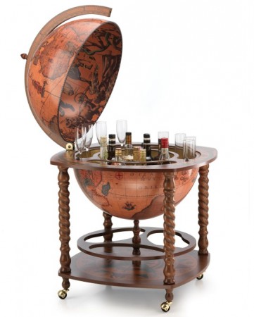 Підлоговий глобус бар має у своєму розпорядженні сферу, діаметром небагато 60 см, завдяки чому там можна зберігати не одну пару пляшок з міцними напоями включаючи склянки для їхнього розпиття. Такий подарунок легко прикрасить інтер'єр робочого кабінету, показуючи іншим, що його власник розуміється на елітних речах.