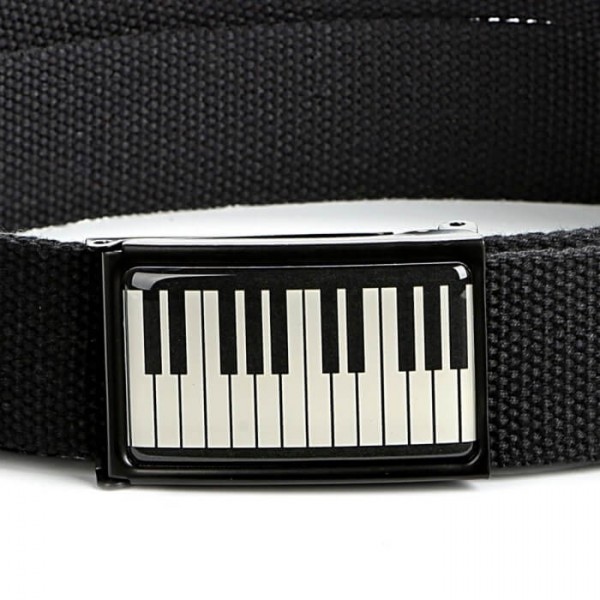 Чудовий ремінець із якісної тканини, який дуже гармонійно виглядатиме з будь-яким Вашим вбранням. Ремінь оснащений оригінальною бляхою із зображенням клавіш піаніно, що точно сподобається музикантам. Така річ займе гідне місце серед ваших аксесуарів.