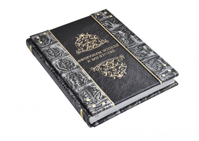 Обкладинка книги дворівнева оформлена рельєфним золотим тисненням (фольга "Luxor 240"), вставками із плетеного шкіряного шпагату (колір "Bronze"), латунними холітенами, кількістю 12 шт.