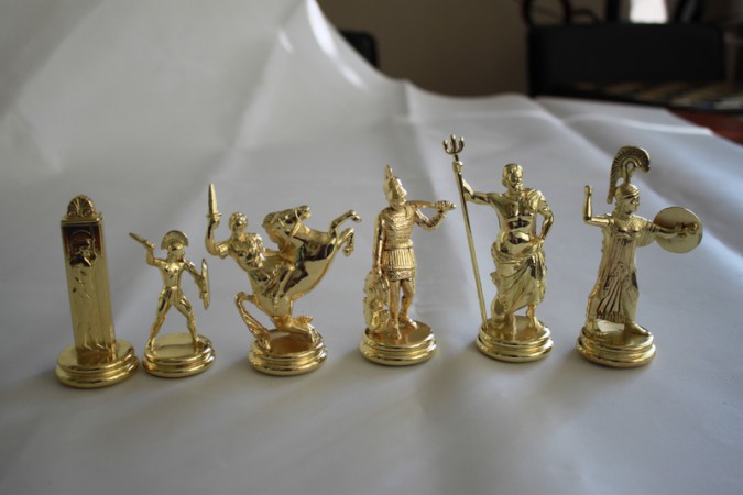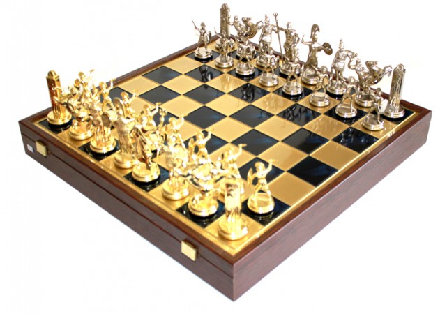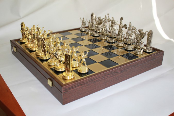 Чудовий набір шахів, завдяки якому Ваше дозвілля буде проводитися в дуже елегантній та цікавій манері. Шахи виготовлені з латуні, дошка з дерева – такі матеріали забезпечать довготривале використання набору. А унікальний дизайн викликає захоплення у всіх любителів історії та справжніх спортсменів.