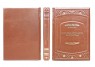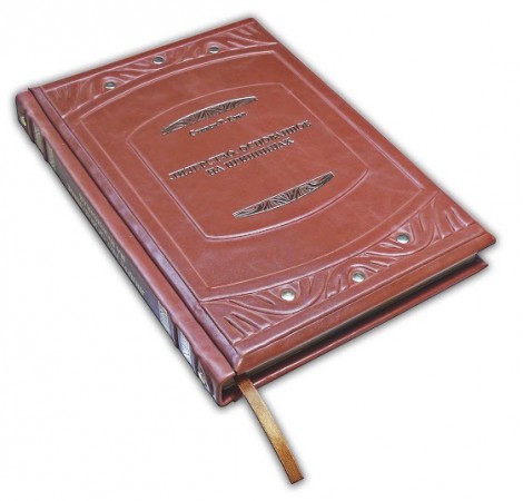 Французька обкладинка ручної роботи, виготовлена з натуральної італійської шкіри теля «terracotta». Обкладинка книг оформлена об'ємними візерунками ручного тиснення, рельєфним тисненням золотою фольгою Luxor в 24 карати, холітенами (колір "Gold") кількістю 8 шт. Обріз книги полірований та позолочений вручну сусальним золотом.
