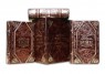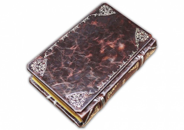 Французька складова палітурка ручної роботи виконана і комбінації натуральних шкір (шкіра «Grash», шкіра «Vetro grigio» виробництва італійської шкіряної фабрики «Benericetti»). Обкладинка книг та футляр-ложемент оформлені багаторівневим тисненням - глибоким блинтовим та рельєфним золотим, з використанням фольги «Luxor 240», внутрішнє оздоблення футляра встелене парчою «Marrone reaper». Обріз книг полірований та позолочений вручну.
